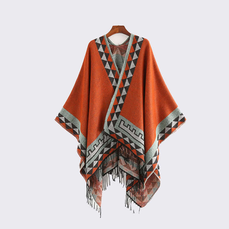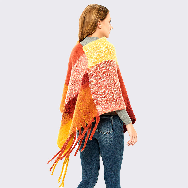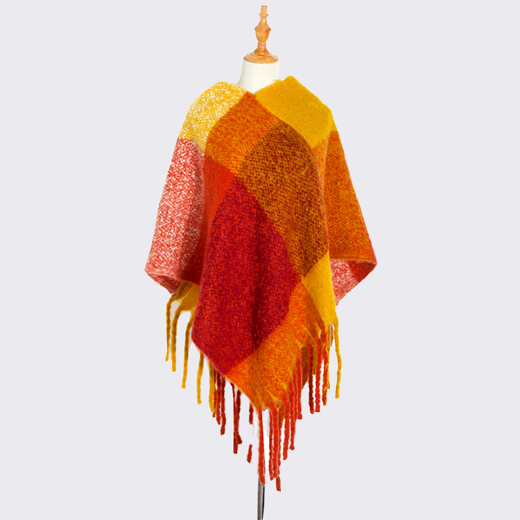 Classic Plaid Shawls And Wraps, Thickened Fringe Trim Poncho Sweater For Women