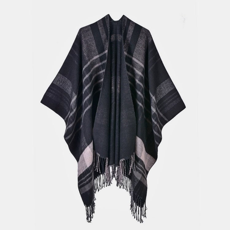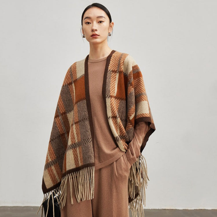 Wool Blend Cape Sweater Fringe Check Poncho Open Front Shawl Wrap